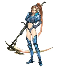 Both her weapon and armor are completely unique to her. Her Death Scythe has the ability to blind and confuse opponents if she hits them, which may help against fighting multiple foes.