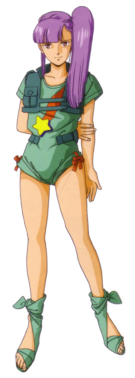 Roux Louka (ルー・ルカ) became a recruit of A.E.U.G after the bloody Gryps Conflict. Unlike Judau and his junk dealing friends, she joined on her own free will and carries a higher sense of military duty than her comrades. She is a skilled pilot and associates herself with a personal shooting star emblem. When isolated from her allies near the beginning of the series, Roux playfully uses her charms to appeal to the Neo Zeon captain, Mashymre Cello, by acting as a harmless lady lost in space. Mashymre humorously agrees to shelter the woman pilot without question and orders the then recruit Glemy Toto to escort her. Though she betrays Glemy's trust during her return to Argama, their brief encounter started his rather zealous infatuation with her.