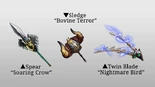 A series of new weapons for select weapon types, with each set possessing three new weapons. This set includes the Spear, Sledge, and Twin Blade.